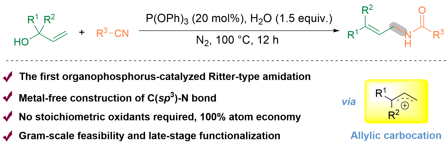 近日,AC米兰化工学院朱龙志博士在国际学术期刊《Green Chemistry》(中科院一区TOP期刊,影响因子9.2)上发表题为“Metal-free triphenyl phosphite-catalyzed Ritter-type amidation of allylic alcohols”的学术论文(DOI:10.1039/D5GC03351A)。据悉,该研究团队首次报道了一种无金属、无氧化剂参与,由亚磷酸三苯酯催化的烯丙醇Ritter型酰胺化反应。该方法在温和条件下实现100%原子经济性的酰胺合成,兼容多种烯丙醇与腈类...