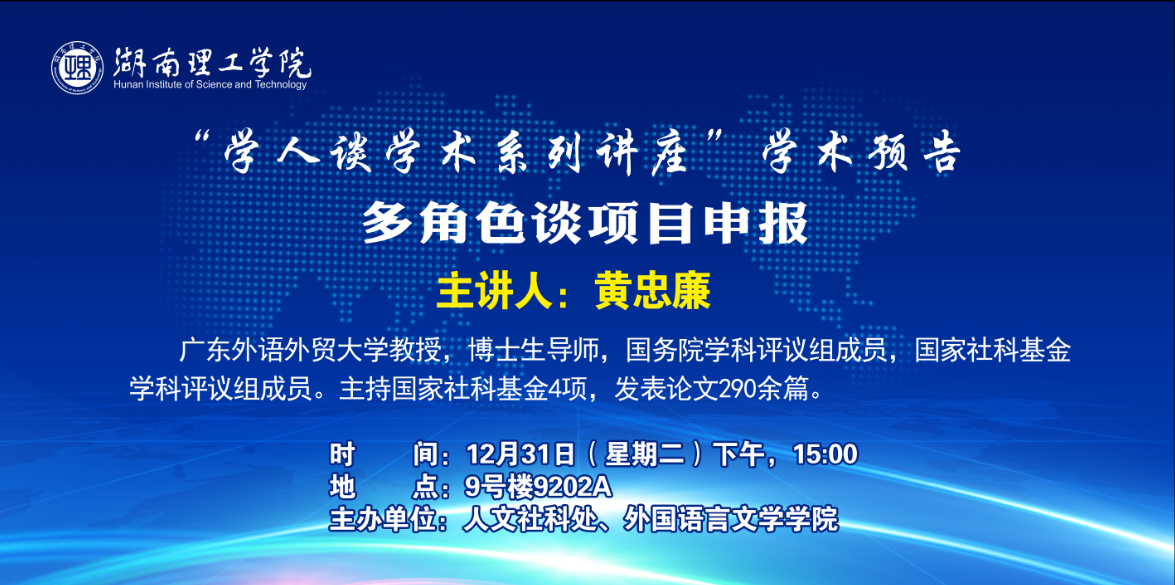 <span>主讲人:</span>黄忠廉<br/> <span>主题:</span>“学人谈学术系列讲座”预告——多角色谈项目申报<br/> <span>时间:</span>2019年12月31日(周二)下午三点<br/> <span>地点:</span>9号楼9202A
