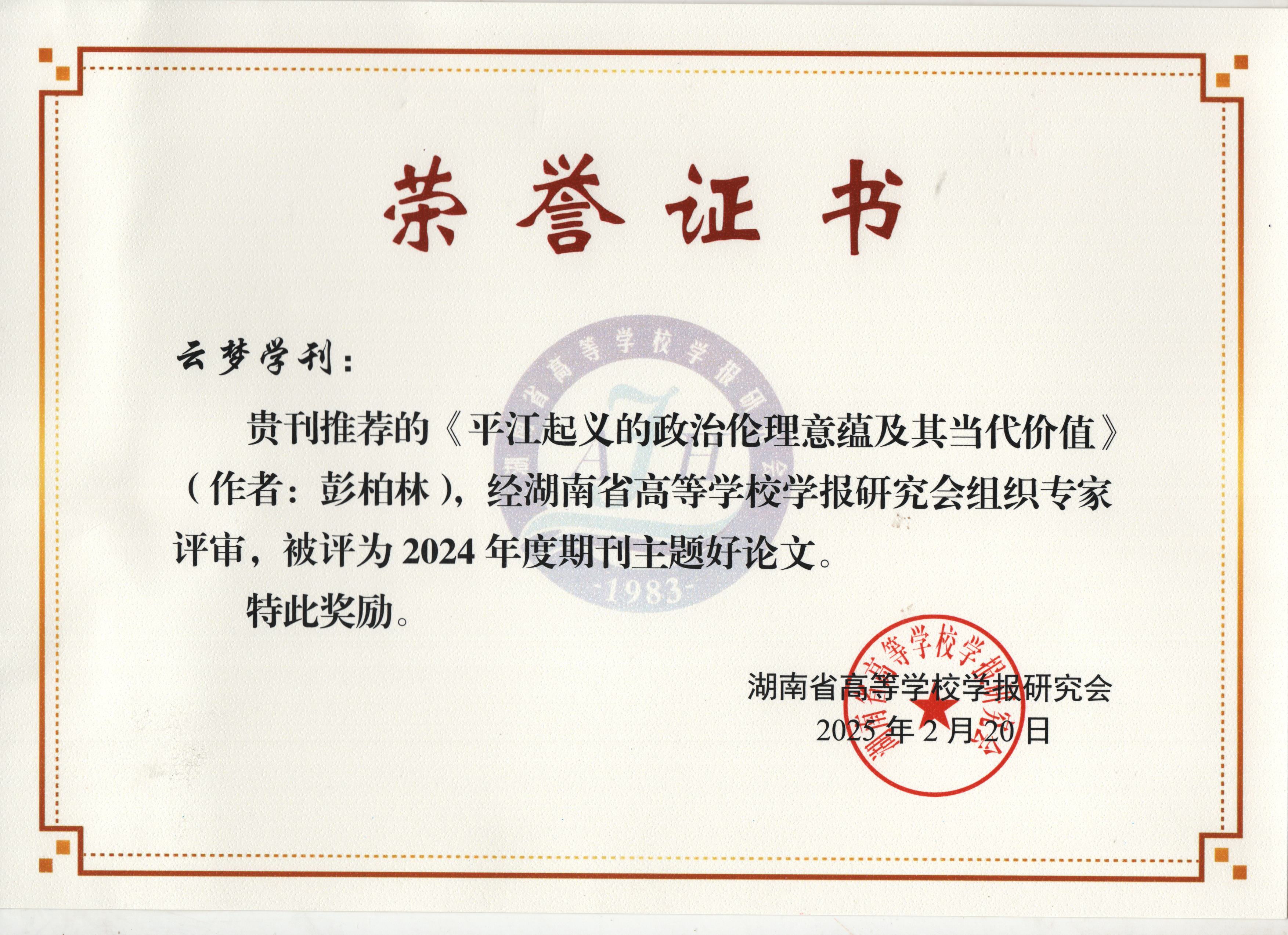 校园网讯近日,湖南省高等学校学报研究会2024年度会员大会在湖北咸宁召开。会议公布了2024年湖南省高等学校学报研究会关于“学习贯彻二十大、二十届三中全会精神,推动学术期刊高质量发展”为主题的主题论文、编辑学论文(论著)的评选结果,AC米兰彭柏林教授发表于《云梦学刊》2024年第1期的文章《平江起义的政治伦理意蕴及其当代价值》被评为“2024年度期刊主题好论文”。该文学习宣传贯彻党的二十大报告提出的“弘扬以伟大建党...