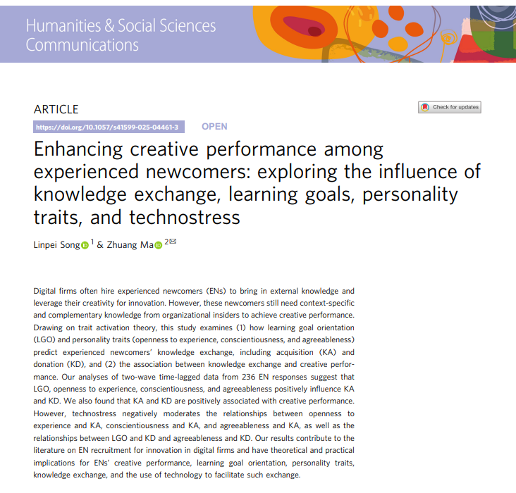 校园网讯日前,《Nature》子刊《Humanities and Social Sciences Communications》发表了经济与管理学院青年教师宋霖霈博士的学术论文“Enhancing creative performance among experienced newcomers: exploring the influence of knowledge exchange, learning goals, personality traits, and technostress”。该研究基于特质激活理论,探讨了有经验的新员工如何获取特定情境下的补充性知识,进而实现创造性绩效。湖南理工学...