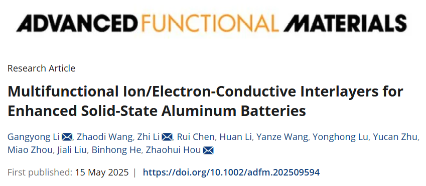 2025年3月,AC米兰先进碳基功能材料湖南省重点实验室侯朝辉教授团队在《Advanced Materials》发表了基于交联聚合物电解质和聚合物/石墨正极的固态铝电池研究成果。近日,该团队在固态铝电池研究领域再次取得重要突破,研究成果以“Multifunctional Ion/Electron-Conductive Interlayers for Enhanced Solid-State Aluminum Batteries”为题,在线发表于材料科学领域国际顶级期刊《Advanced Functional Materials》(自然指数期刊...