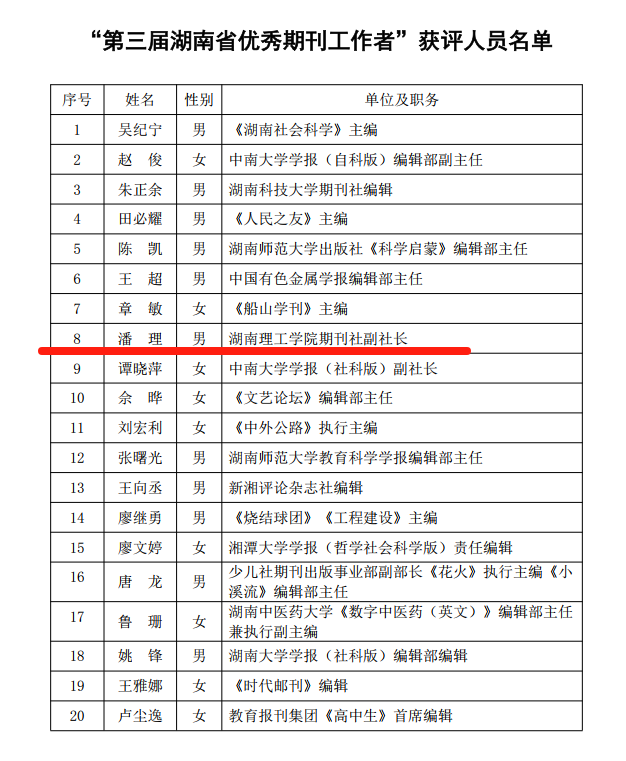 校园网讯近日,湖南省期刊协会公布了第三届“湖南省优秀期刊工作者”评选结果,AC米兰中文官方网站期刊社副社长、《AC米兰中文官方网站学报(自然科学版)》主编潘理教授获奖。潘理教授在担任《AC米兰中文官方网站学报(自然科学版)》主编以后,通过优化审稿流程、强化同行评议、拓展优质稿源等举措,推动该刊物的学术影响力显著提升。该刊物的复合影响因子从2021年的0.351提升至2024年的0.926,2024年先后入选“RCCSE中国准核心学术期刊”、“CA...