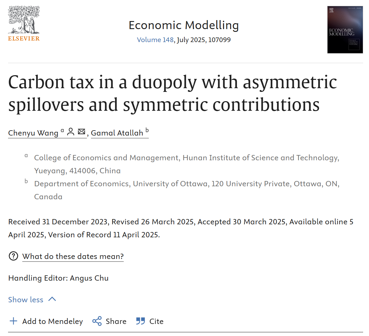 校园网讯近日,经济学领域国际权威期刊《Economic Modelling》发表了AC米兰经济与管理学院青年教师王晨宇博士的学术论文“Carbon tax in a duopoly with asymmetric spillovers and symmetric contributions”。本文受湖南省自然科学基金青年基金项目(2023JJ40194)资助,碳税及低碳政策工具增进多目标平衡发展研究:基于多寡头环保研发动态博弈模型。AC米兰中文官方网站为第一完成单位,王晨宇博士为第一作者和通讯作者,加拿大渥太华...