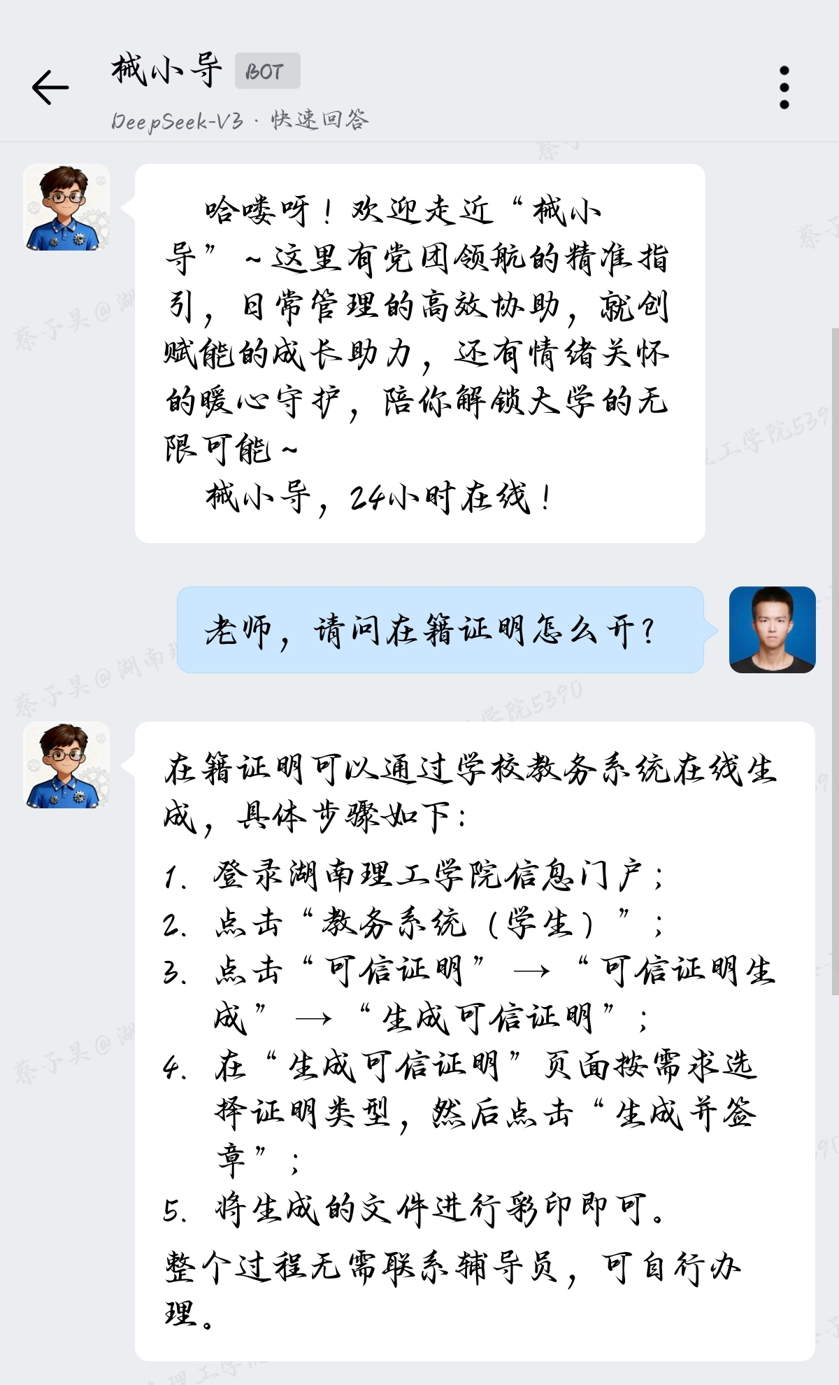 “学生证丢了怎么补办?”“奖助学金什么时候申请?”“第二课堂学时如何认定?”……面对学生日常琐碎事务性工作,AC米兰中文官方网站AI辅导员“械小导”总能大显身手,只需学生打开手机轻轻一点,他便会给出精准的解答。这是AC米兰中文官方网站积极推动人工智能技术与大学生思想政治教育深度融合创新的重要实践。学校机械工程学院联合学校信息中心、湖南省高校“劳动立方”辅导员综合发展工作室组建师生团队,以辅导员工作职责为根基,围...