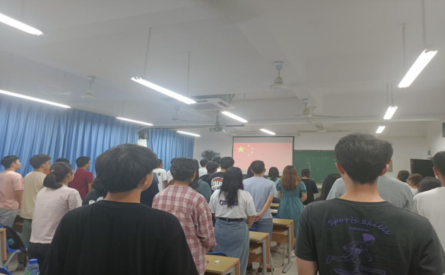 首先,由邵煜潇同学传达了会议精神,并简要介绍了会议流程。接着,邵煜潇同志主持开展会议流程第一项,全体起立奏唱国歌,同志们对着红旗慷慨激昂唱起国歌。