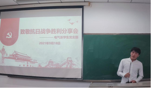 最后,支部副书记刘洁总结发言,引导电气系学生党支部成员在追忆抗战历史中,缅怀革命先烈的丰功伟绩,继承和发扬伟大的抗战精神,听党话、跟党走,为党建设贡献一份力量,将爱人民,爱党,爱国情怀落实到实践中。