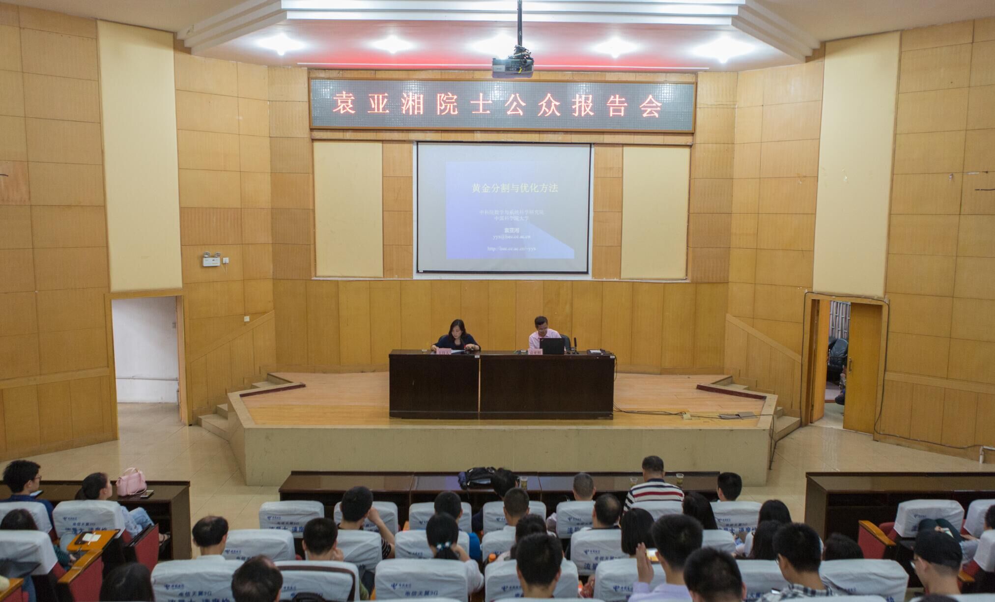 校园网讯 “我喜欢站着讲课,因为站着讲课不仅是对学生的尊重,也是对知识的尊重。”5月11日下午,在东院学术报告厅内,一场以“黄金分割法与优化”为主题的公众报告会在袁亚湘院士缓缓站起的身姿与现场师生的热烈掌声中拉开帷幕。科技处、研究生处相关负责人、数学学院部分教师以及2015级全体学生,部分研究生代表参加,报告会由副校长徐小立主持。