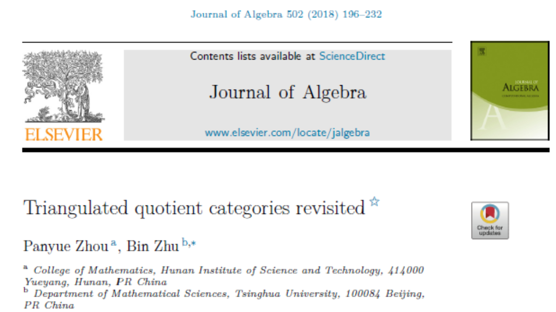 校园网讯 日前,数学学院湖南省普通高校科技创新团队成员周潘岳博士以第一作者身份在国际代数学领域顶尖期刊“Journal of Algebra”发表长达37页的学术论文“Triangulated quotient categories revisited”。“Journal of Algebra”杂志被国际代数学领域公认为最好的学术刊物。