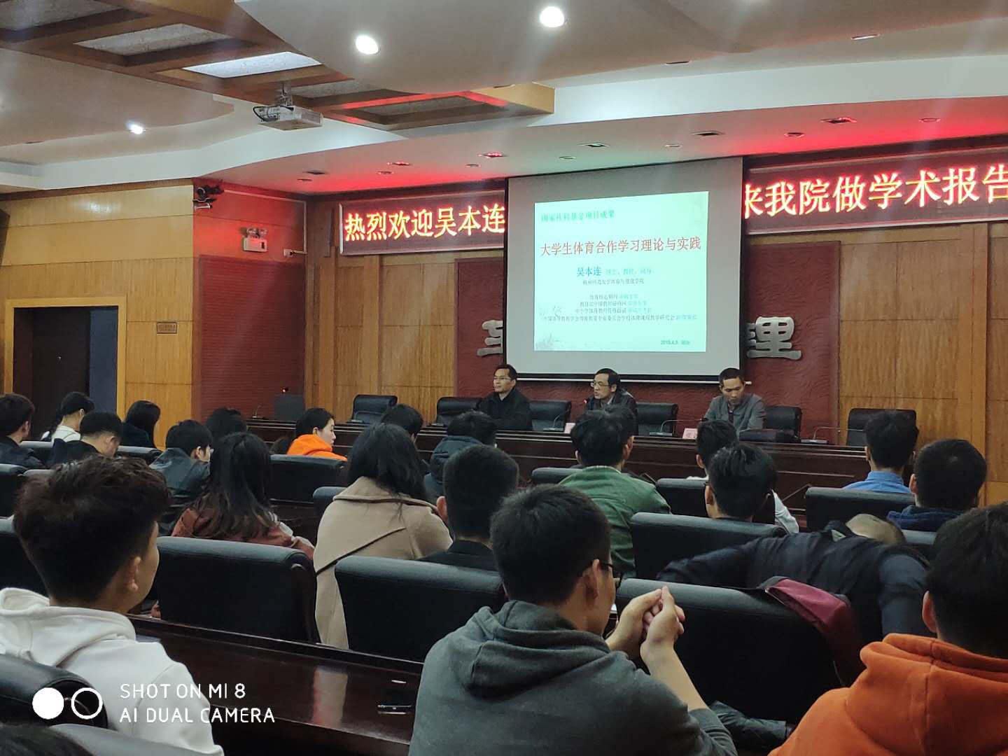 在学术报告中,吴本连教授以《大学生体育合作学习理论与实践》为主题进行阐述。他从量表编制的五个方面向同学们讲解了如何让问卷更加合理、有效,深入浅出、有理有据。并以自身经历告诉同学们“知识改变命运,学习成就未来”的道理。