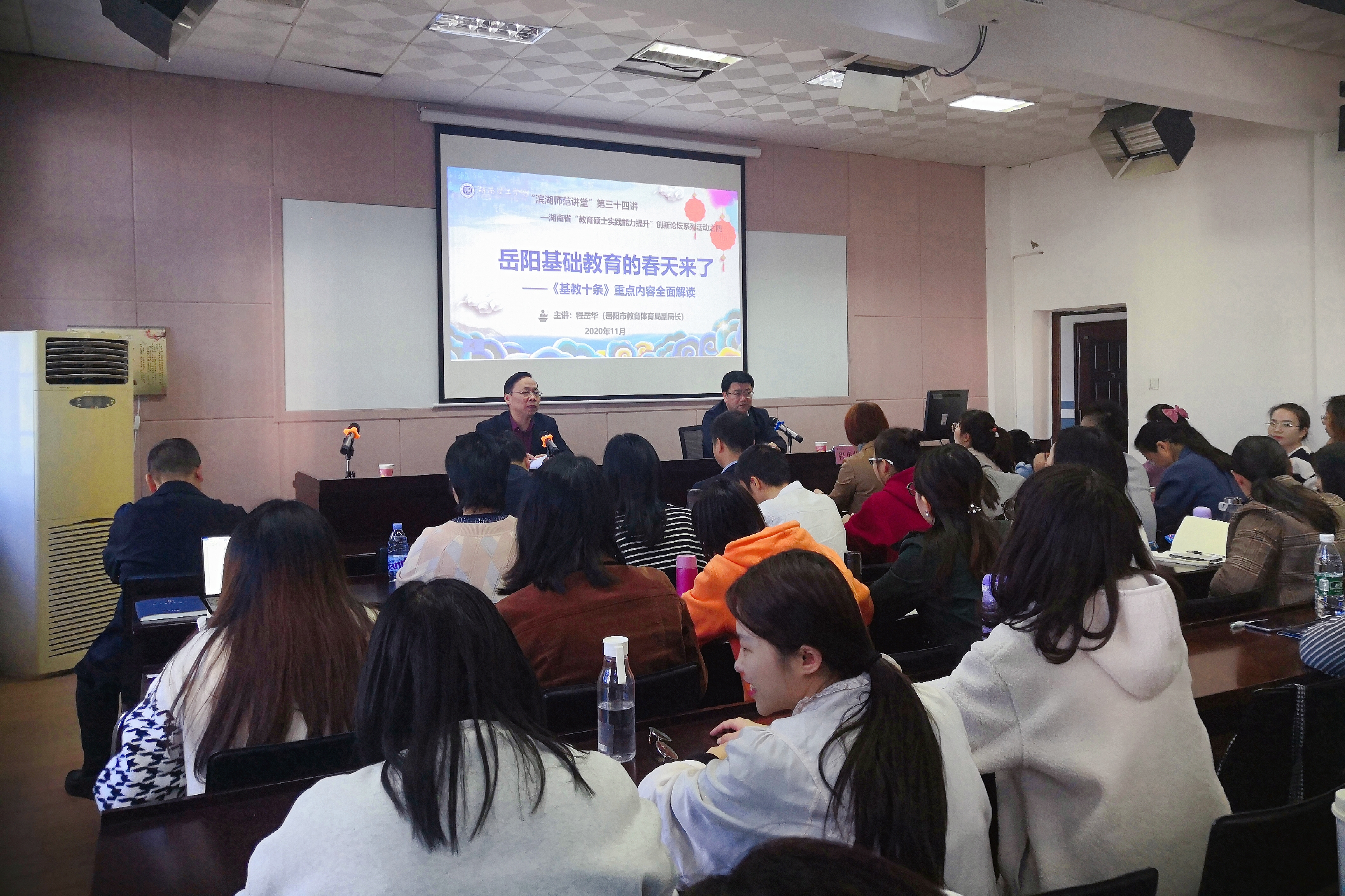 校园网讯 11月13日上午,由AC米兰教育科学学院主办的湖南省“教育硕士实践能力提升”创新论坛系列活动之四(“滨湖师范讲堂”第三十四期)在1号教学楼1302教室举行。本期主题为“岳阳基础教育的春天来了——《基教十条》重点内容全面解读”。特邀岳阳市教育体育局副局长程岳华主讲,教科院总支书记刘淳松、副院长彭阳红和全体教育硕士研究生120余人参加了本次活动。本次讲座由教科院院长刘理主持。
