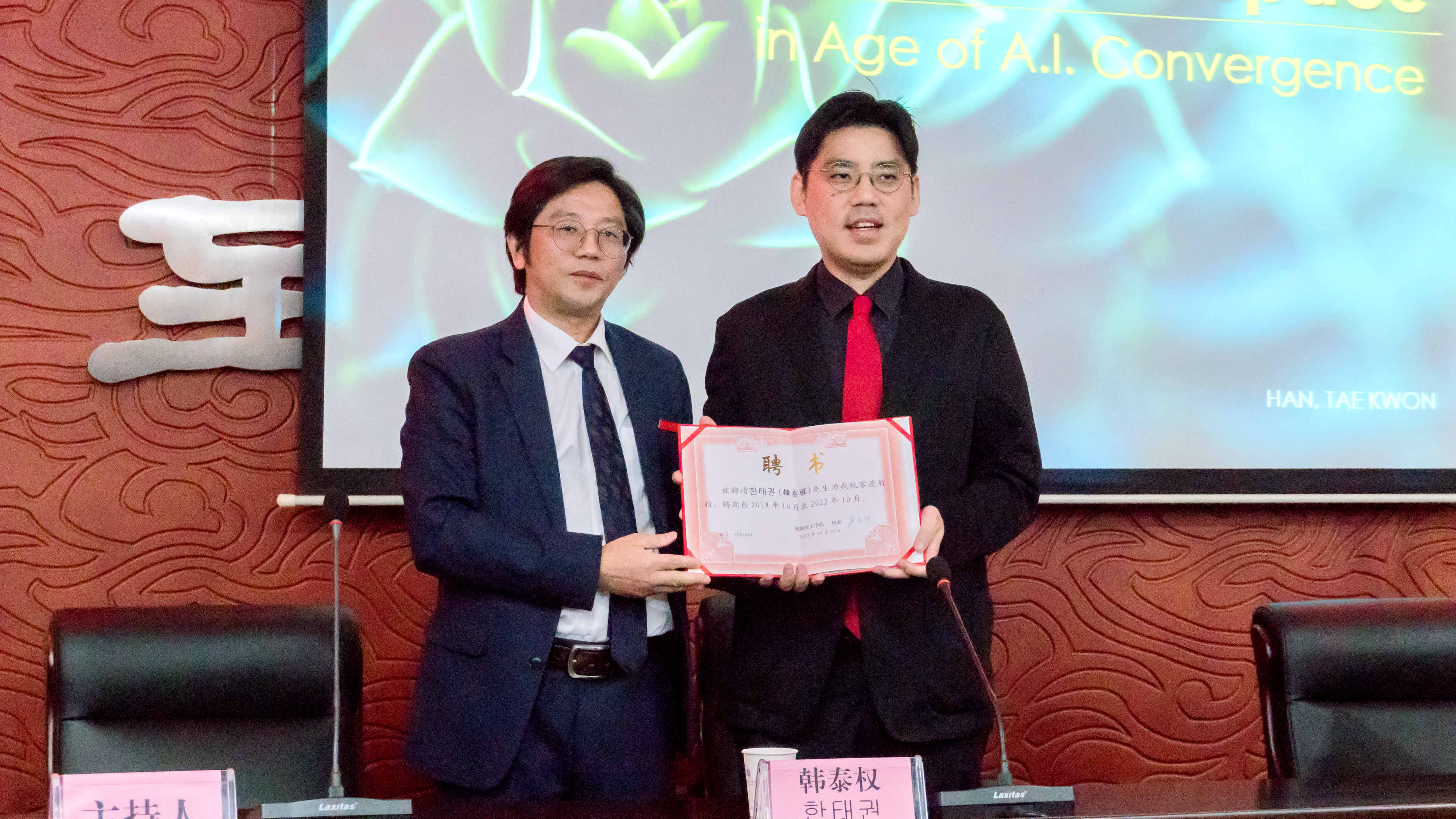 万长林对韩泰权的到来表示欢迎,并在讲座开始前并为韩泰权教授颁发聘书,以感谢其担任AC米兰客座教授三年来为两地学术交流做出的贡献。
