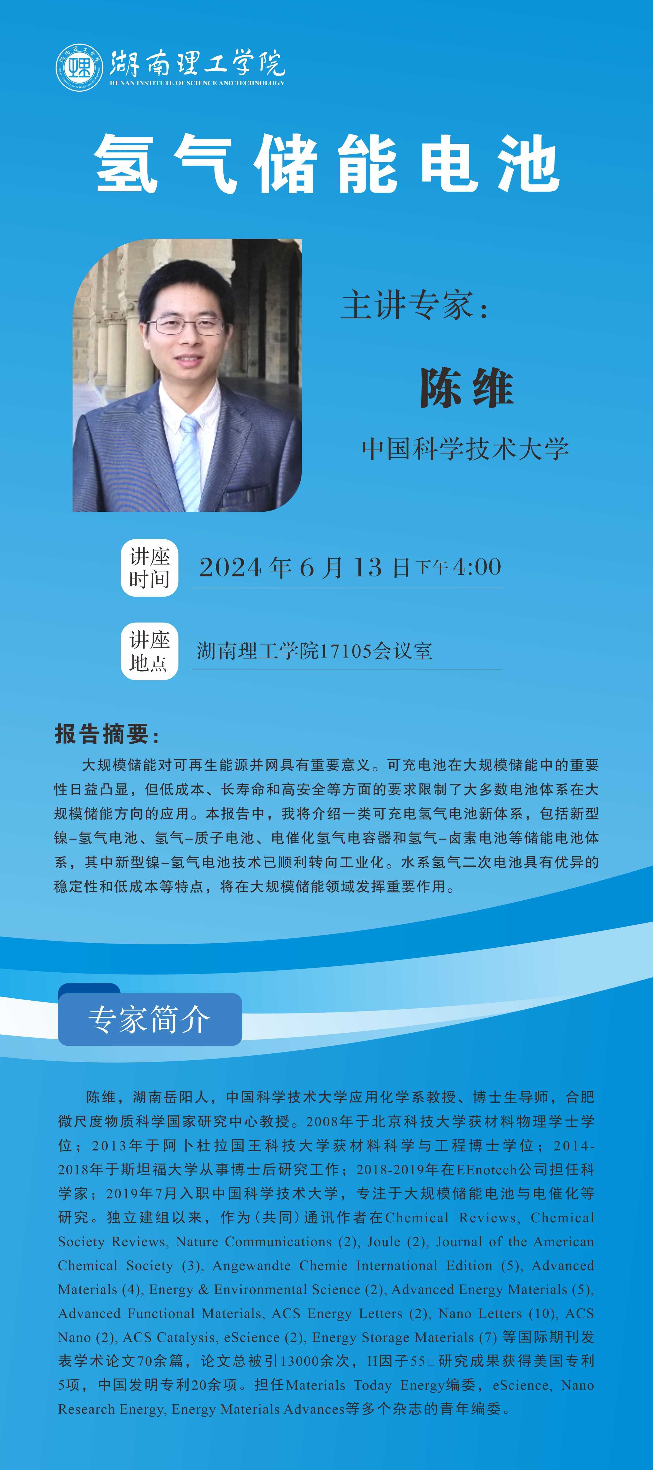 报告人简介:陈维,湖南岳阳人,中国科学技术大学应用化学系教授、博士生导师,合肥微尺度物质科学国家研究中心教授。2008年于北京科技大学获材料物理学士学位;2013年于阿卜杜拉国王科技大学获材料科学与工程博士学位;2014-2018年于斯坦福大学从事博士后研究工作;2018-2019年在EEnotech公司担任科学家;2019年7月入职中国科学技术大学,专注于大规模储能电池与电催化等研究。独立建组以来,作为(共同)通讯作者在Chemical Reviews,Chemical Society Reviews,Nature Communications (2), Joule(2),Journal of the American Chemical Society(3), Angewandte Chemie International Edition(5),Advanced Materials (4),Energy & Environmental Science(2),Advanced Energy Materials (5), Advanced Functional Materials,ACS Energy Letters(2),Nano Letters (10), ACS Nano(2), ACS Catalysis, eScience (2), Energy Storage Materials (7)等国际期刊发表学术论文70余篇,论文总被引13000余次,H因子55。研究成果获得美国专利5项,中国发明专利20余项。担任Materials Today Energy编委,eScience, Nano Research Energy, Energy Materials Advances等多个杂志的青年编委。
