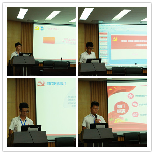 在雄壮的国歌声中大会拉开帷幕。各学生党支部支委代表依次上台做了本学年工作汇报,从执行决议、两学一做、制度遵守、党员发展、教育学习、引领带动、先锋模范、创新特色等八个方面进行了总结。学生党建支委联席会主席团代表秘书部、组织部、宣传部、培训部、党员之家等五个部门向第三届支委联席会做了本学年工作汇报。