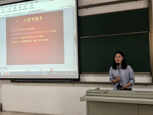 随后,支部纪检委员李威、组织委员高坤为新生们简要地介绍了机械系学生党支部概况及入党流程。优秀党员代表赵琛上台发言,她结合自己丰富的大学三年生活,亲切真诚地为刚刚踏入校园的新生们分享自己的学习工作经验,希望大家努力学习,积极入党。