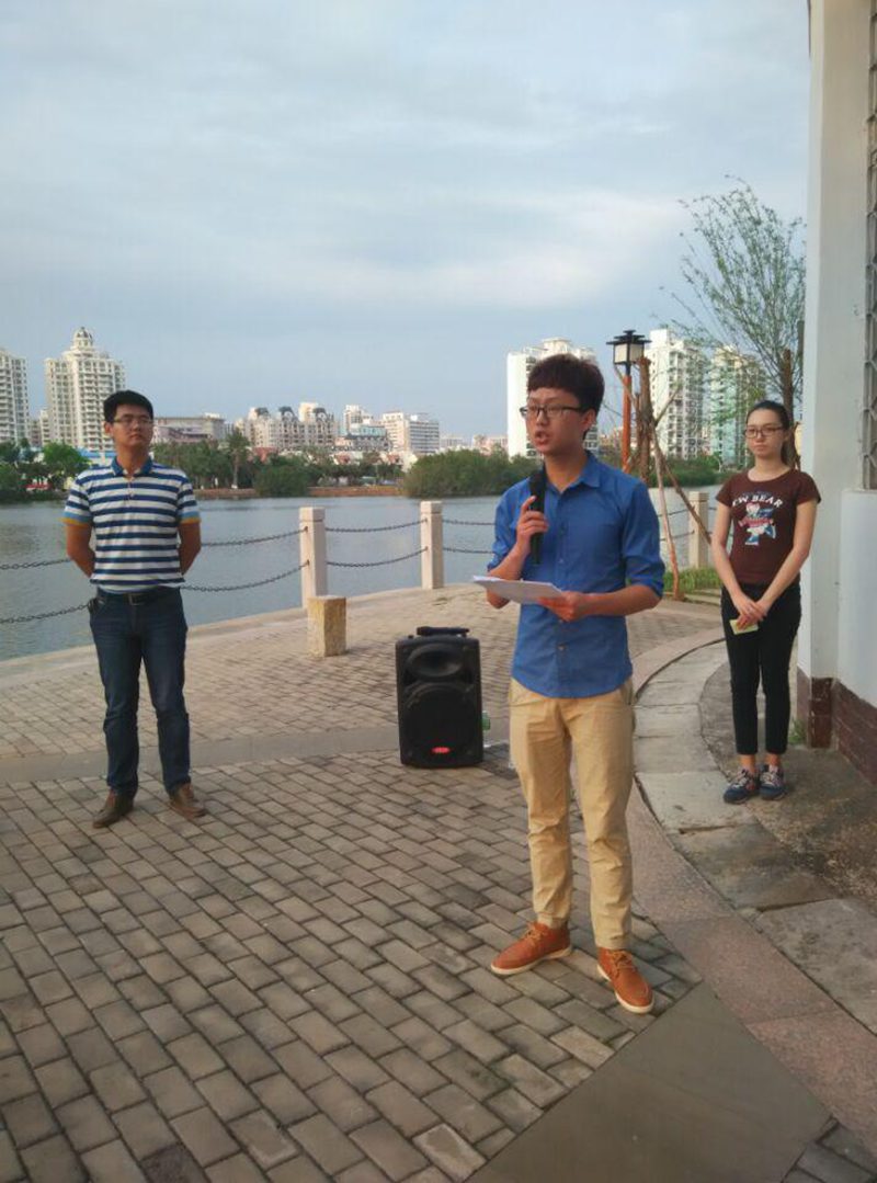 学期伊始,夕阳余晖中的东坡湖畔美丽如初,2015年3月9日新学期英语角启动仪式于下午5时45分如期在东坡湖畔举行。学院党委黄国标副书记,辅导教师崔万春、崔建兵、王寅、李青出席本次活动。晨读英语角工作人员、学院学生干部、班干部代表,以及参与晨读的学生们共同参加了启动仪式,吴晓冰主持活动。