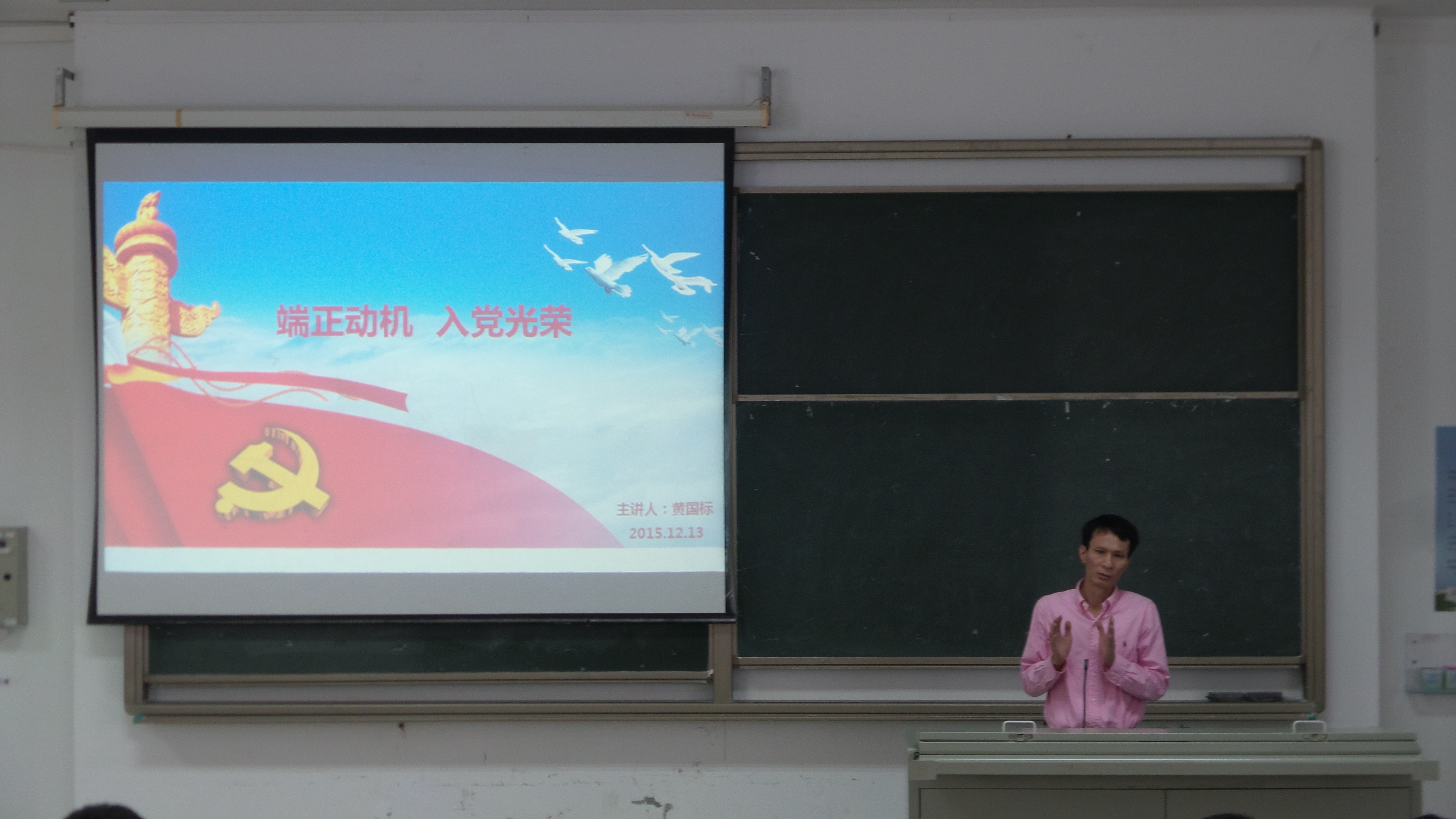 培训班第一讲邀请学校组织部副部长杨智平老师作《党章解读》讲解,针对党章的历史发展、形式地位、内容形式作了解读;第二讲由李宏副书记作《大学生党员先进性》讲解,李宏副书记寓教于乐、寓学于情,通过现场问卷、现场演讲、交流互动等形式与学员共同探讨党员先进性的问题;第三讲由致远传承宣讲团的同学们进行宣讲,宣讲日恰逢国家公祭日,宣讲前首先进行了集体默哀仪式,接下来的宣讲围绕抗战七十周年、南京大屠杀等历史活动展开;第四讲由学院黄国标书记作《端正动机入党光荣》讲座,黄书记通过讲解党的光辉历史、科学理论、标准要求帮助学员树立正确的入党动机和党的认识,鼓励大家争取早日达到一名共产党员的标准。