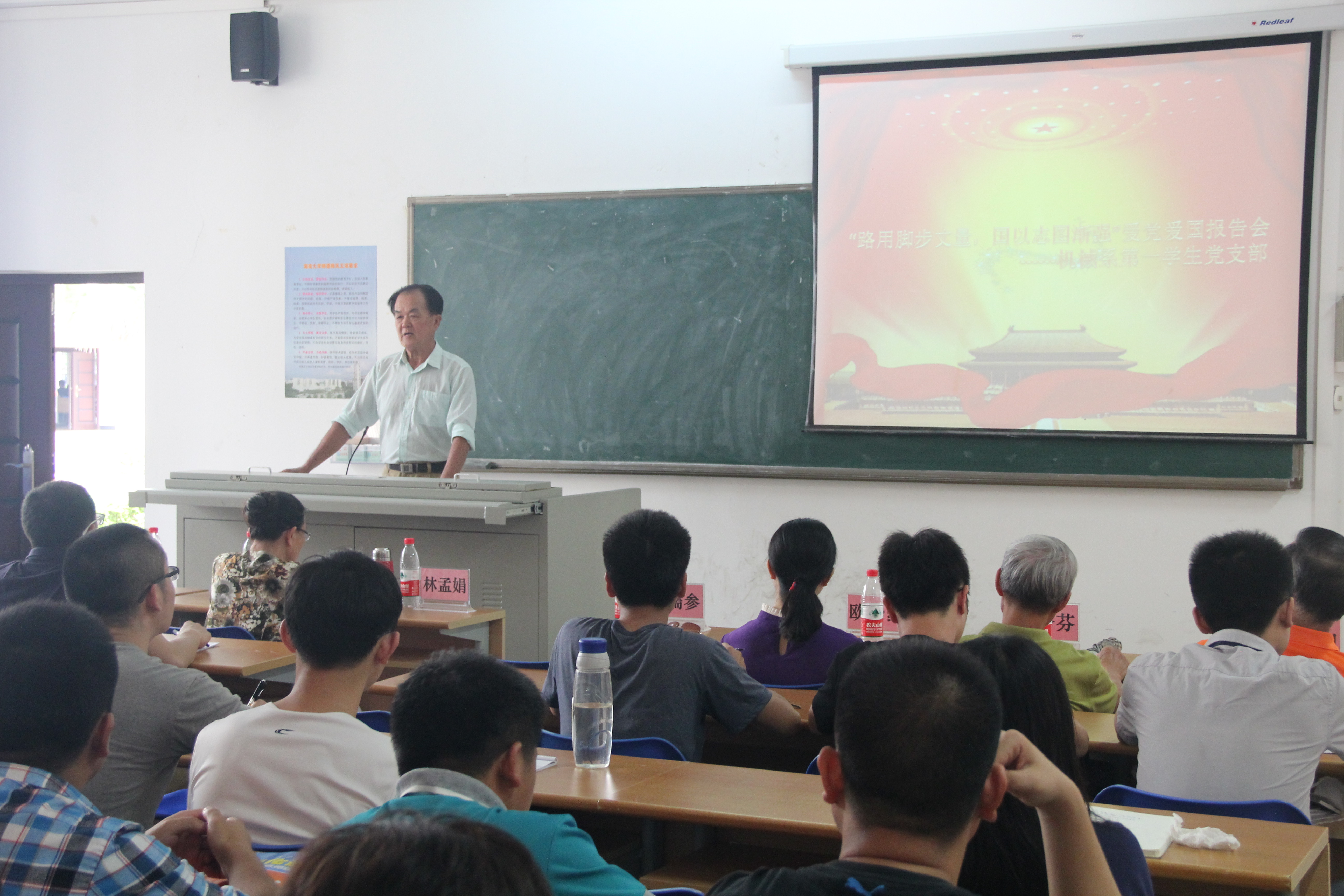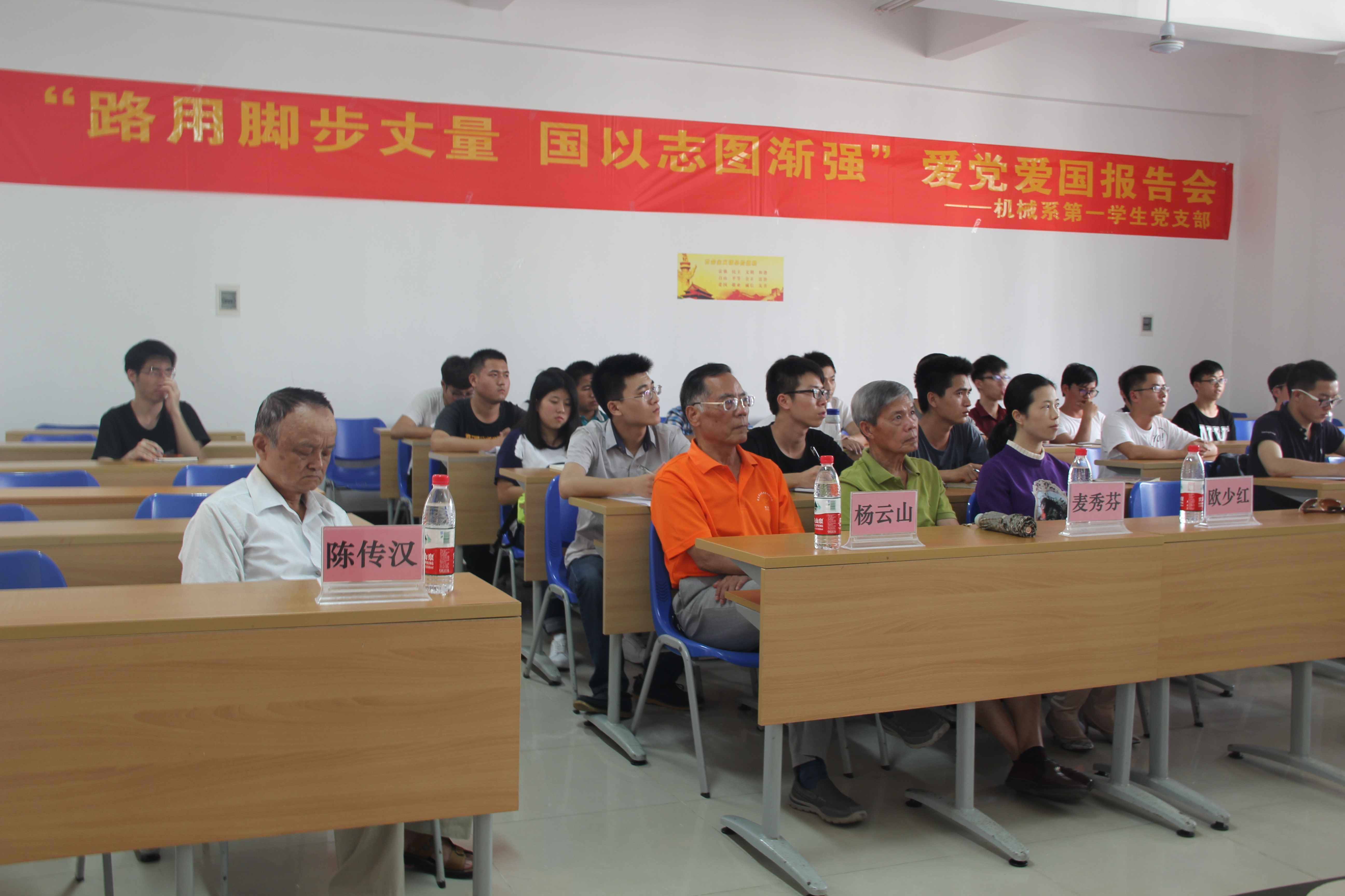 为了积极响应党中央“学党章党规、学系列讲话,做合格党员”的“两学一做”学习教育号召,加强学生党员的党性修养建设。必赢线路检测3003机械系第一学生党支部于四月十五日下午在4-109隆重举行主题为“路用脚步丈量,国以志图渐强”的爱党爱国报告会,出席报告会的有必赢线路检测3003no1关工委、党史国史宣讲团成员程儒参、杨云山、陈传汉、麦秀芬、林孟娟老师,必赢线路检测3003党委李宏副书记,信息科学与技术学院党委会秘书欧少红,机械系第一学生党支部书记崔建兵,参支部党员、入党积极分子约40人参加本次活动。报告会由宣传委员金杯主持。