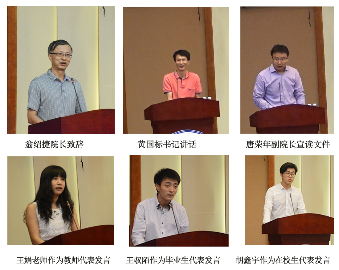 王娟老师作为教师代表发言,她用诗情画意的言语同毕业生回望曾经、展望未来,祝福毕业生创造属于自己的明天。王驭陌作为毕业生代表发言,他对学院领导老师的指导和关心表达了由衷的感谢,立志以青春之我创青春之国家,用社会主义核心价值观引领人生,用奋斗的青春年华回报母校的深情。在校学生代表胡鑫宇向毕业生表达了最美好的祝福。