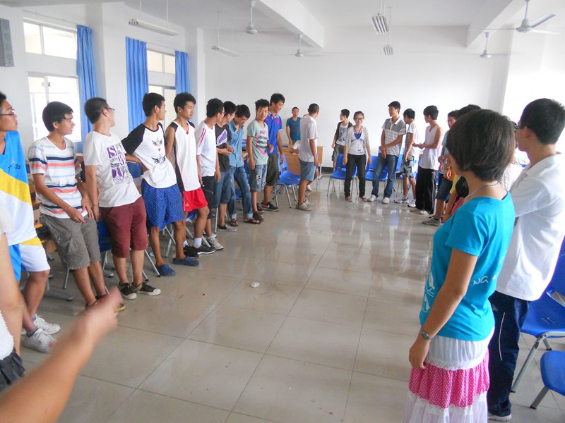 考虑到学生此阶段的心理特点与需要,在心理素质拓展训练营中,我们着眼于“自信”,“人际交往”“培养团队合作精神,增强团队观念”三大主题,以游戏、角色扮演、小组讨论等体验式的课堂形式对学生进行训练,以促进大学生的自我认识和自我悦纳。为了活跃气氛,调动同学们的集中注意力,崔建兵老师给大家介绍了“过电”游戏、并让大家体验轻松体操。热身结束后,大家一起做了“刮大风”游戏,调动了大家的积极性,同学们在此次活动中得到快乐的同时,并总结出这个游戏环节的意义,学会观察、了解身边的同学。接着,崔老师给大家介绍了“你说我画”心理互动游戏,同学们都积极的投入到游戏中,会了与人沟通交流,配合默契,场面活跃轻松。