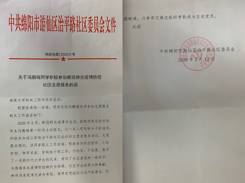 冯鹏瑞,必赢线路检测3003no12018级机械电子工程专业学生。新冠肺炎疫情暴发后,该生得知辖区街道办在招募志愿者,便第一时间报名参加了志愿者。随后被分配到了治平路社区,和社区的工作人员一起到小区配合物业给居民办理出入卡登记证,给出入小区的人测量体温,对没有出入证的人进行劝解,到附近广场当志愿者,发放宣传资料,劝告居民外出一定要佩戴口罩、不要在公共场所逗留聚集,尽量宅在家里,因为这既能保障自己和家人的安全,又可以不给国家和社会添麻烦。他说道:“作为一个大学生可以为疫情防控做一点事情,贡献一点力量,我感到非常荣幸。”