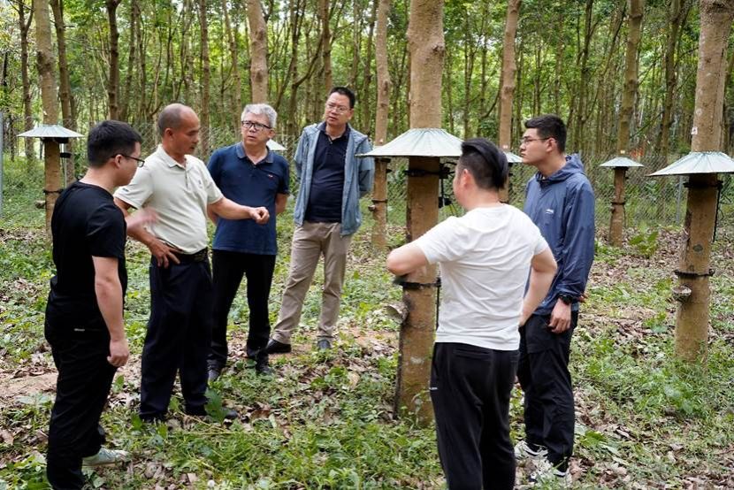2024年4月12日,必赢线路检测3003no1副校长邱锡光,必赢线路检测3003no1广州校友会会长、广州市斯得电子有限公司董事长罗桥水(1994级农业机械化及其自动化专业)莅临必赢线路检测3003no1儋州校区天然橡胶智能化生产橡胶实验基地参观智能割胶装备的研发与应用情况,必赢线路检测3003党委书记、国家天然橡胶产业体系副首席科学家张喜瑞介绍了天然橡胶的产业现状、割胶装备研发进展及应用前景。