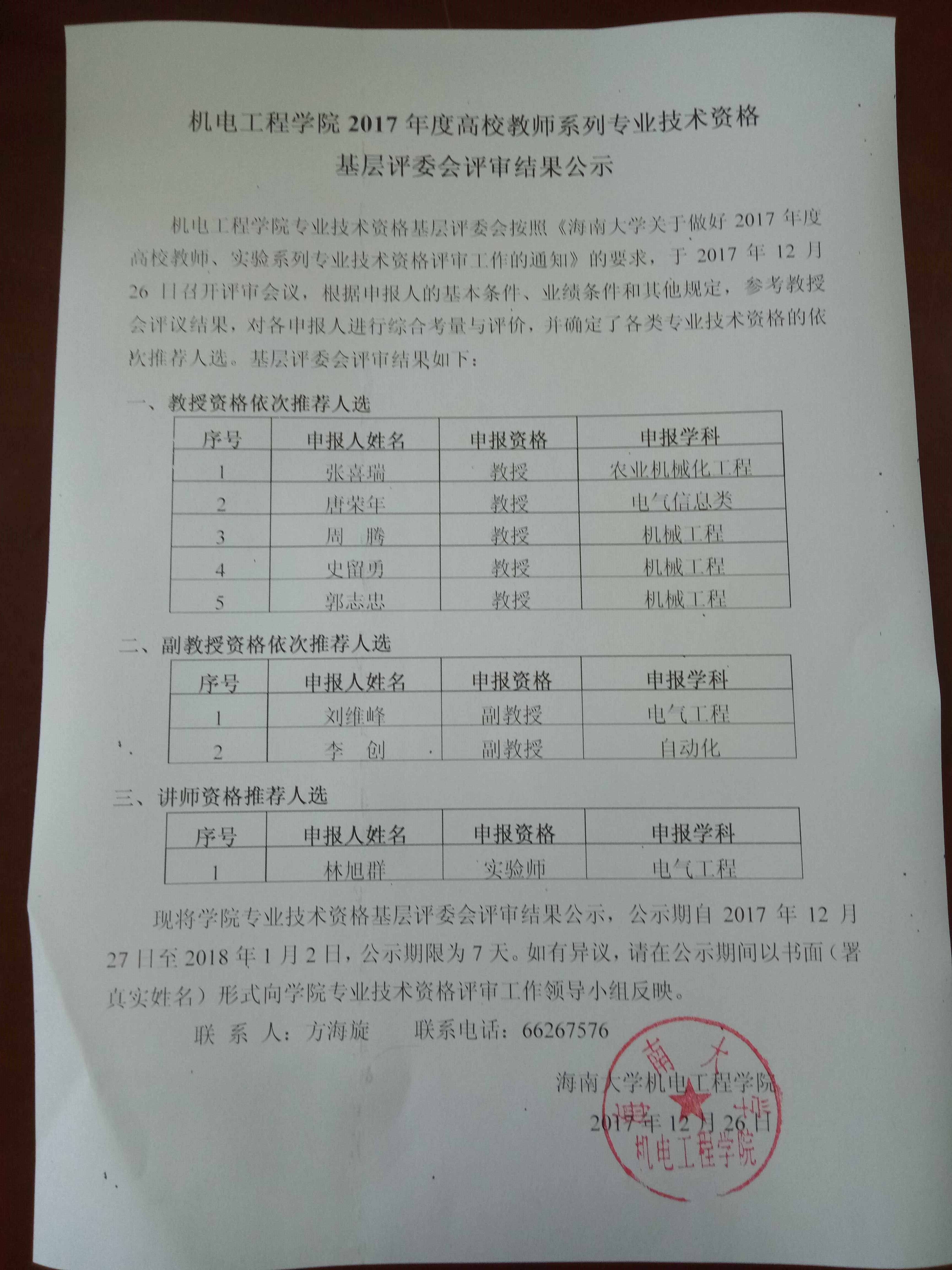 现将学院专业技术资格基层评委会评审结果公示,公示期自2017年12月27日至2018年1月2日,公示期限为7天。如有异议,请在公示期间以书面(署真实姓名)形式向学院专业技术资格评审工作领导小组反映。
