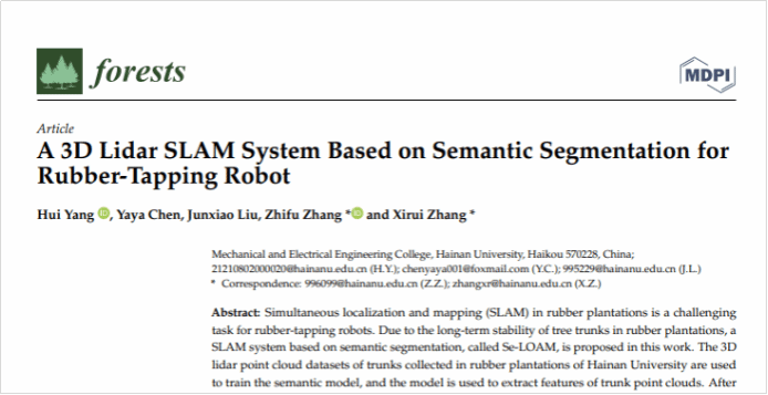 近日,必赢官网天然橡胶智能化生产团队2021级硕士研究生杨慧同学在张喜瑞教授和张志富副教授的共同指导下,在中科院二区SCI期刊FORESTS上发表最新学术论文(如图1所示),题目为“A 3D Lidar SLAM System Based on Semantic Segmentation for Rubber-Tapping Robot”。