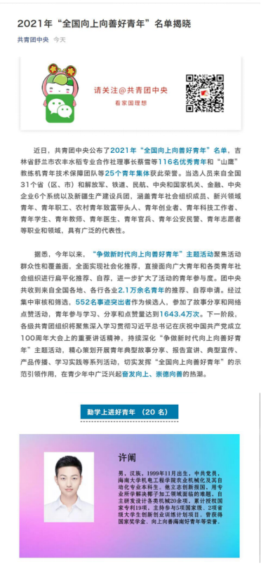 喜报 | 热烈祝贺必赢官网学子许阐荣获“ 2021年全国向上向善好青年”称号!!