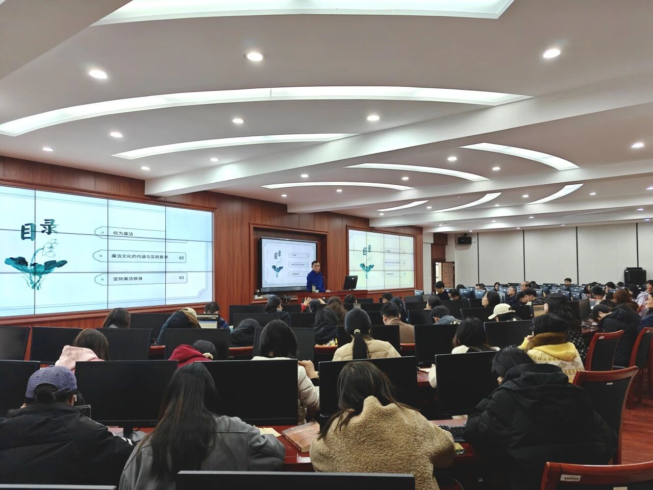 谢贵辉书记围绕“何为廉洁”“廉洁文化的内涵与实践要求”“坚持廉洁修身”三个方面展开深入讲授。他首先从理论高度系统阐释了廉洁的本质要求和时代意义,指出廉洁不仅是道德准则,更是政治要求和行为规范。随后,他结合高校工作实际,深刻剖析了廉洁文化的核心内涵,强调要在教育教学、科学研究、管理服务等各环节融入廉洁理念,推动形成崇廉尚洁的文化氛围。最后,谢贵辉教授从修身立德的角度出发,强调全体党员和入党积极分子必须常怀律己之心、绷紧纪律之弦,做到慎初慎微、清廉自持,在思想上筑牢防线,在行动上守住底线。